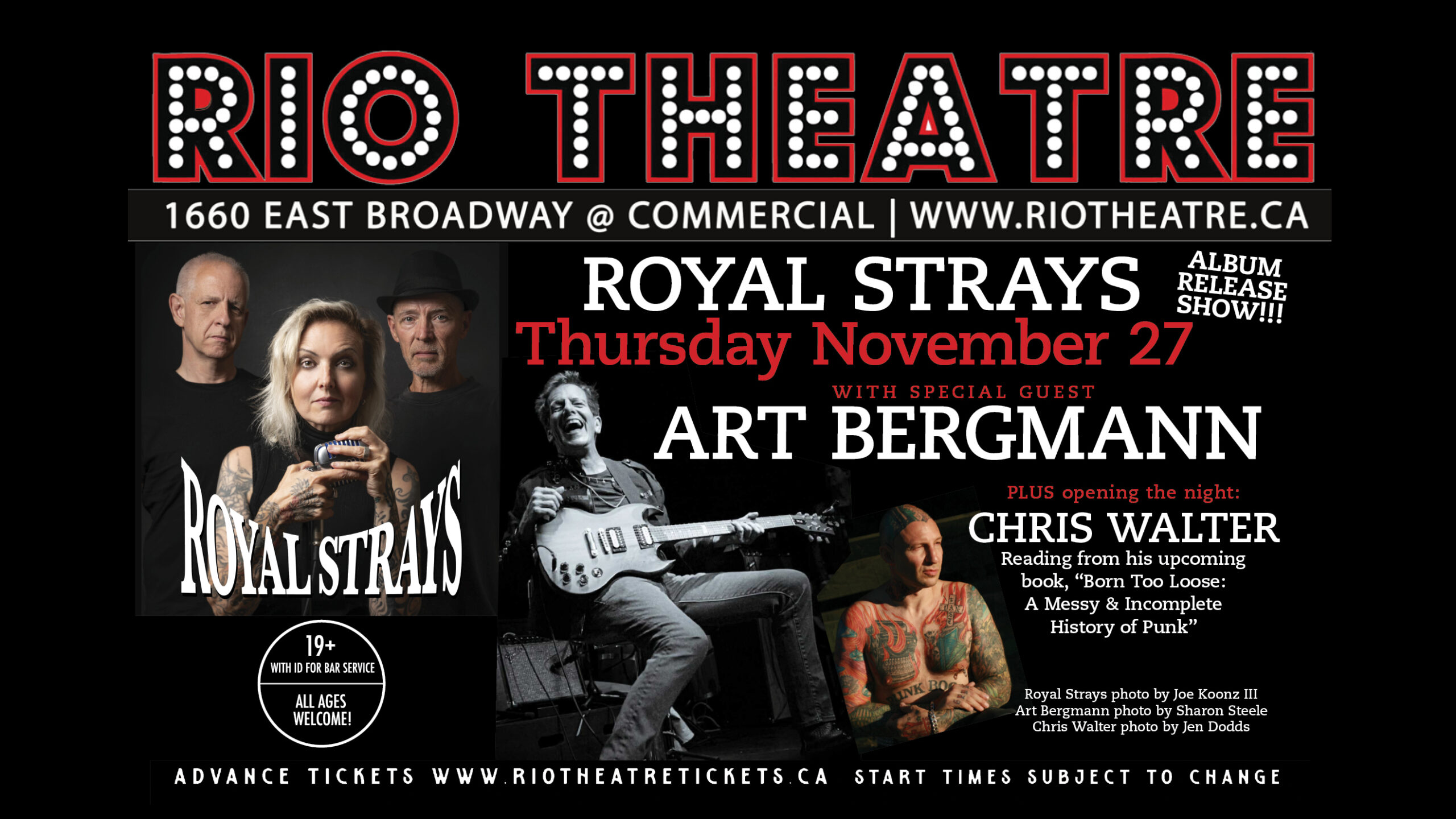 Art Bergmann will open the Royal Strays album release show November 27th at The RIO Theatre in Vancouver! Author Chris Walter reads from his upcoming book “Born Too Loose: A Messy & Incomplete History of Punk” Books – Vinyl – CDs – T-Shirts available – buy your Christmas presents at this gig.